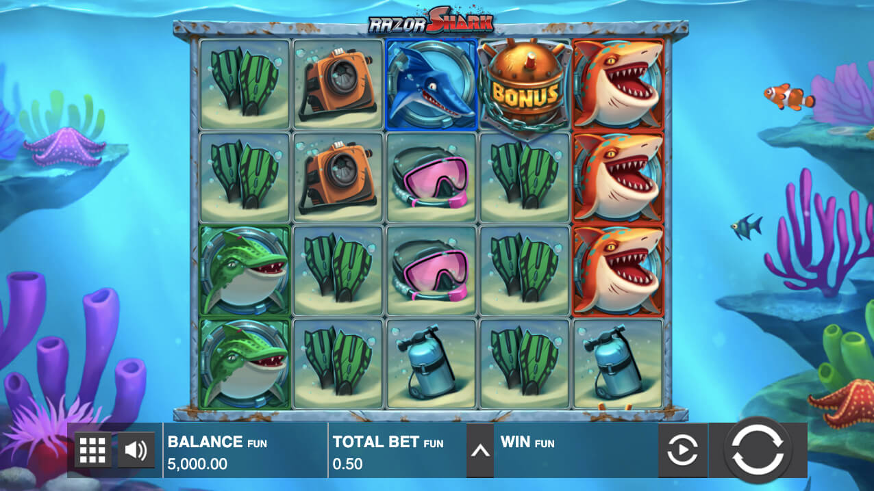O Razor Shark pode ser jogado por apenas 10 centavos por spin. O jogo inclui uma variedade de símbolos, como tanques de mergulho, barbatanas de natação, máscaras de mergulho, câmeras subaquáticas e tubarões coloridos. Os símbolos de tubarão são os mais valiosos. Existem tubarões azuis, verdes, roxos e dourados no jogo. Se você receber uma linha de pagamento completa com 5 tubarões dourados, poderá ganhar 25 vezes sua participação. Além disso, há um grande símbolo de tubarão branco ainda melhor. Pode servir como um selvagem e pode dar um pagamento de 50x se você receber 5 em uma linha.