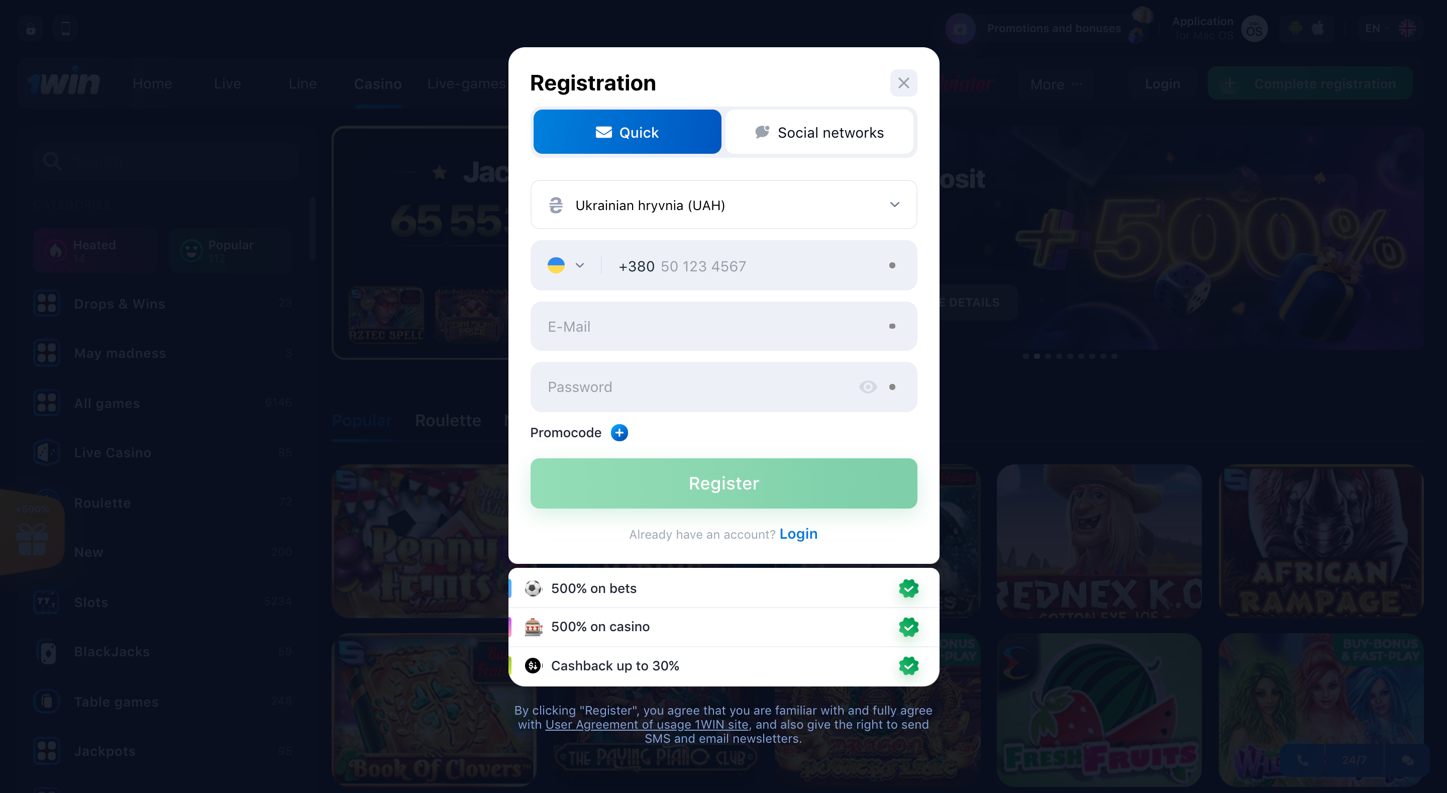 No canto superior direito da página inicial do cassino, você verá um grande botão verde. Clique neste botão para acessar o fácil registro de 1 clique do cassino. Este é um dos nossos recursos favoritos do 1Win Casino, porque realmente facilita e rápidas as coisas para novos jogadores.