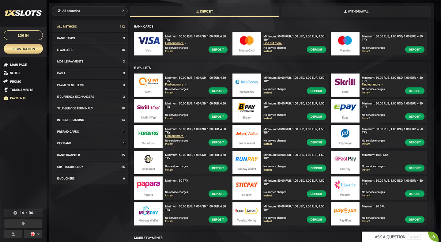O 1XSLOTS permite fazer depósitos e retirar seus ganhos em qualquer moeda, e é por isso que ela possui mais de 100 métodos de pagamento populares integrados.