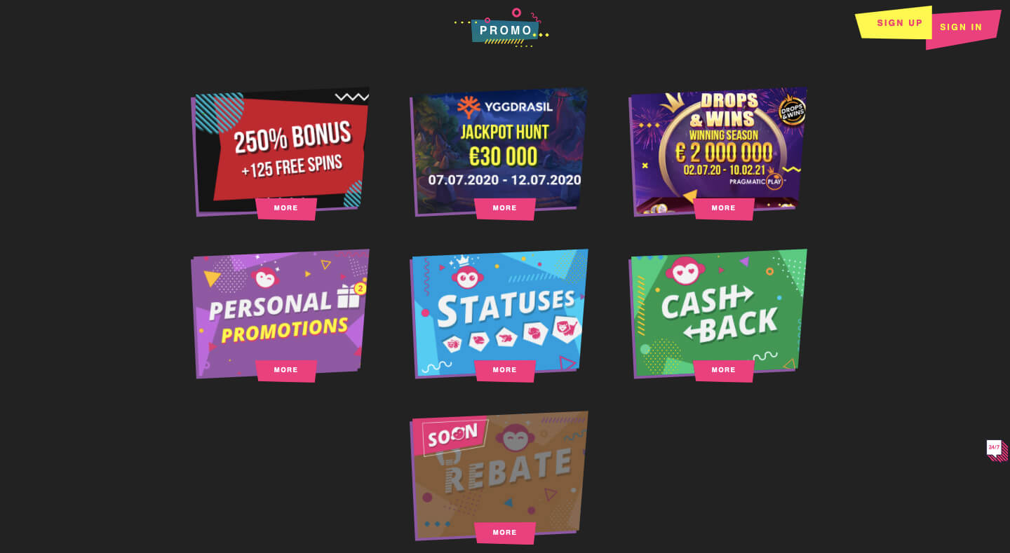 | Programas | Amático, Big Time Gaming, Blueprint Gaming, Jogos em expansão, EGT (Euro Games Technology), Elk Studios, Endorphina, Jogos de evolução, isoftbet, Microgaming, Netent, Cidade de Nolimit, Jogue, Jogo pragmático, Empurre jogos, Quickspin, Tigre vermelho, Spinomenal, Thunderkick, Tom Horn Gaming, Wazdan, Yggdrasil |