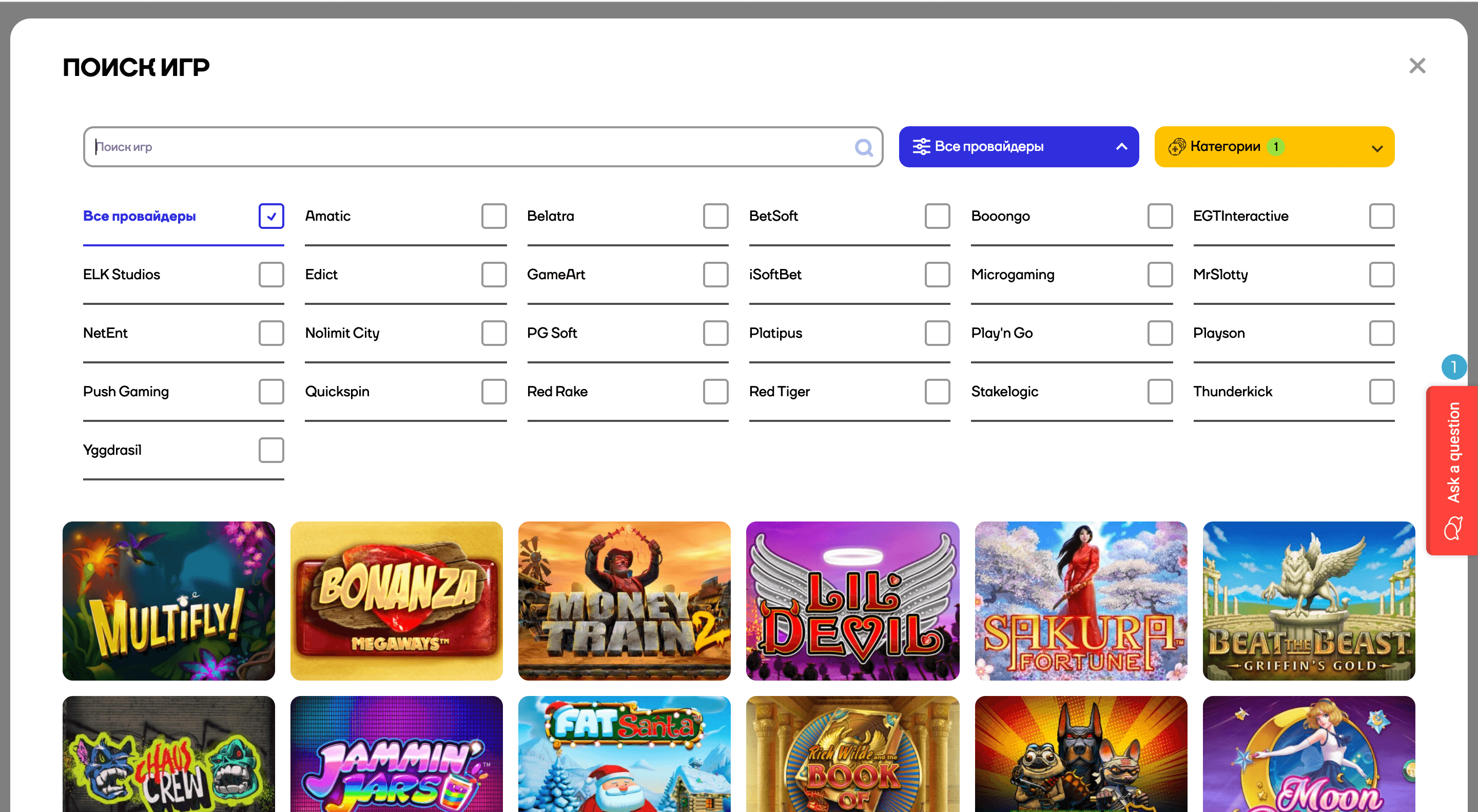 | Programas | Amático, Big Time Gaming, Booongo, EGT (Euro Games Technology), Jogos de evolução, Microgaming, Netent, Jogue, Playson, Jogo pragmático, Empurre jogos, Quickspin, Tigre vermelho, Relaxe os jogos, Yggdrasil |