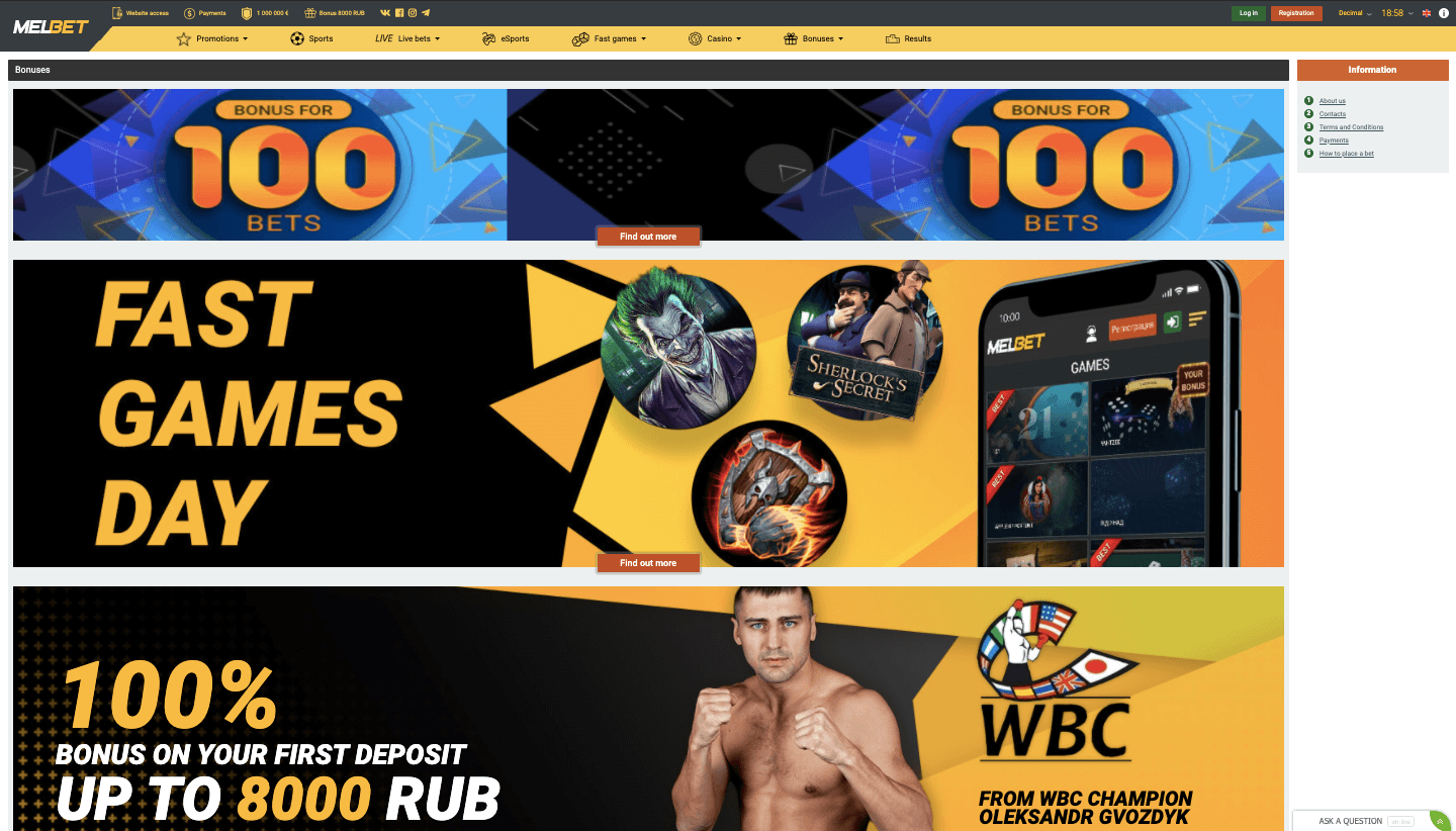 A Melbet é um escritório de apostas e o cassino, fornecendo a seus visitantes uma gama completa de atividades de jogo em um único local. Jogos com revendedores ao vivo e um totalizador, bônus e torneios, códigos promocionais e uma boa alegria para todos os visitantes - esta é a atmosfera do portal.