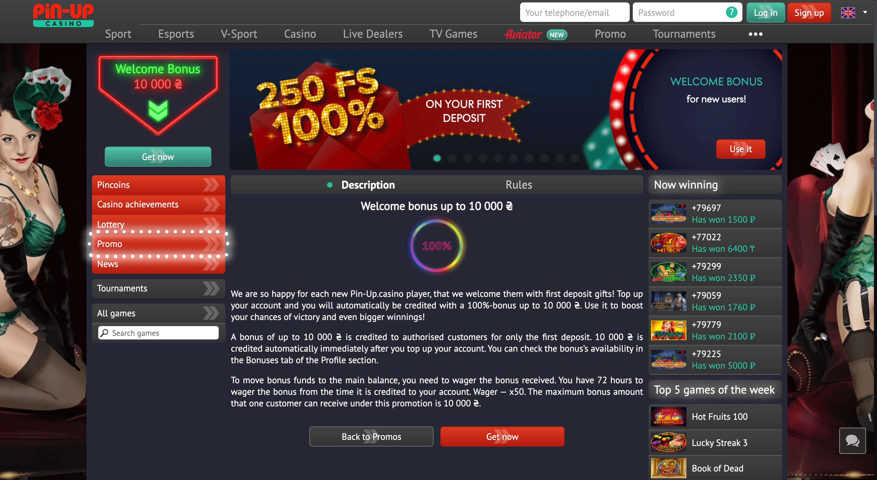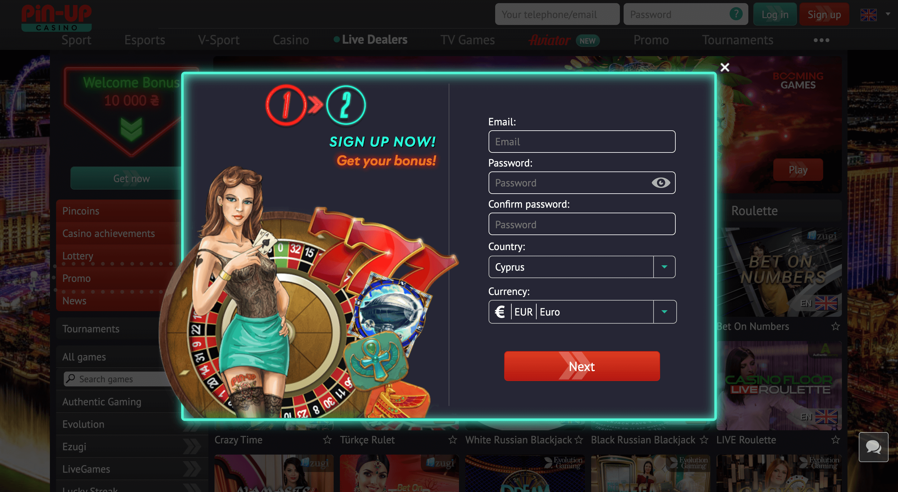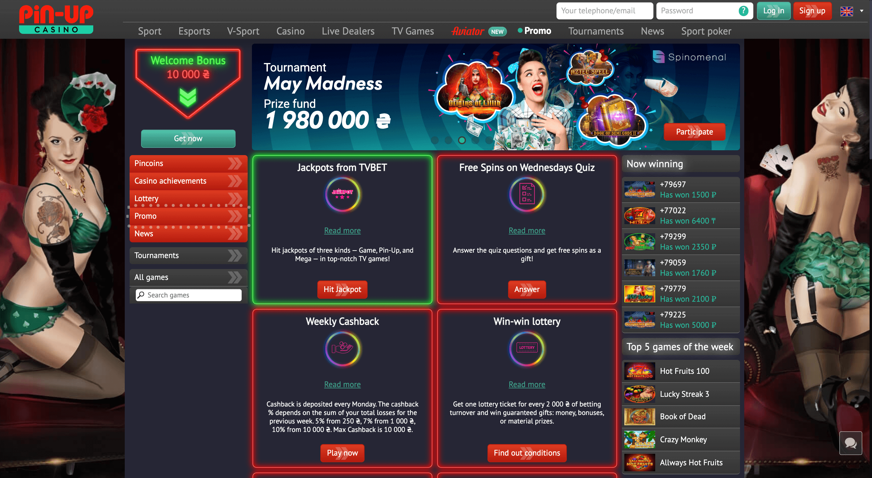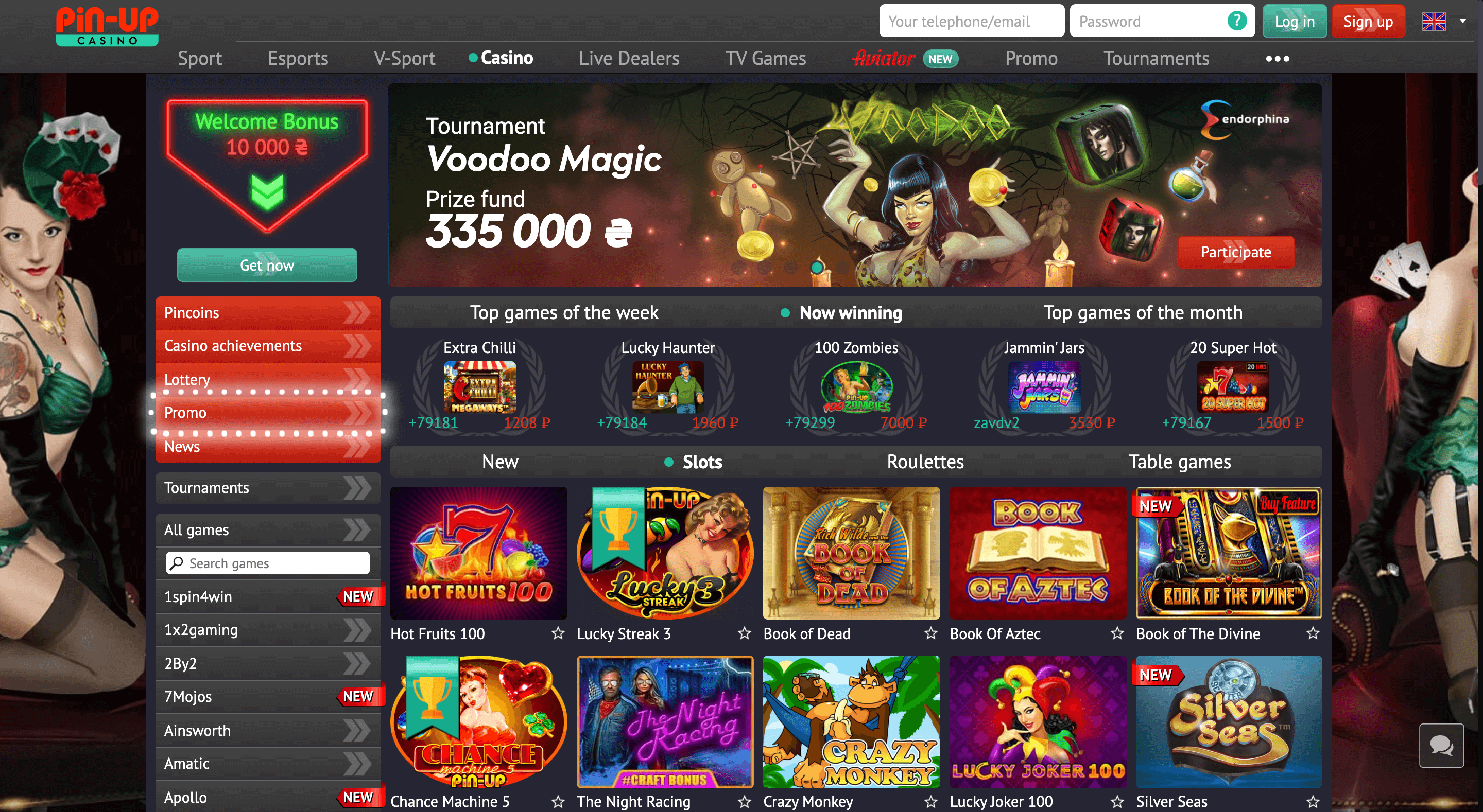 No canto superior direito da página inicial do Pin-Up Casino, você verá os botões de login e registro. Estes são sempre exibidos com destaque nesta área do site do cassino. Logo abaixo disso, você verá outra barra de menus onde pode escolher o seu tipo preferido de jogo. O Pin-Up Casino também oferece apostas esportivas, jogos de revendedores ao vivo e torneios-você encontrará todas essas opções no menu superior. Lá você também encontrará um link para a página de promoções do cassino.
