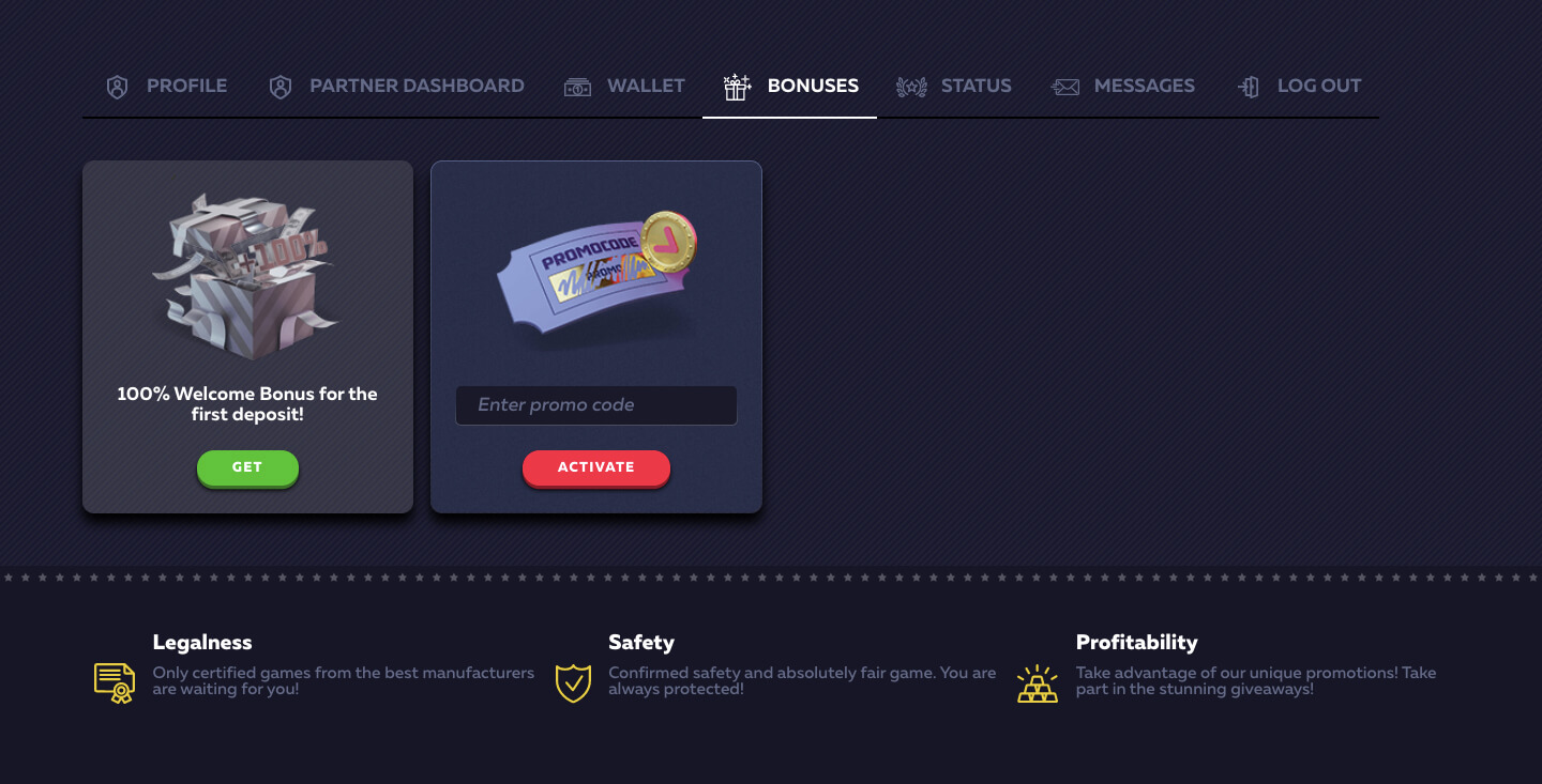 O projeto enfatiza os princípios de sua política, fixando -os no fundo: a lucratividade das promoções, segurança dos pagamentos, jogos e legalidade. O clube é licenciado pelas autoridades de supervisão de Curaçao, portanto, os jogos conectados são certificados.
